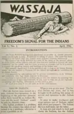 As the threat of American involvement in a European war grew more ominous, the Indian reform movement was ebbing and the Society was racked by internal conflicts.[77] In 1917, a controversy arose within the Society over a government proposal for a separate American Indian U.S. Army regiment. Supporters included Francis LaFlesche, Gertrude Simmons Bonnin, Carlos Montezuma, Father Gordon and Red Fox St. James. However, Parker and the editors of the journal opposed it, concluding Indians should not be segregated from other Americans. They noted that much of the clamor for a spectacular Indian regiment or battalion arose from the showman's brand of Indian as seen in Wild west shows.[78] Debate continued on the abolition of reservation and the Bureau of Indian affairs, and the prohibition of the use of peyote in Indian religious ceremonies.[34] From 1916 to 1922, Carlos Montezuma published his own monthly newsletter, Wassaja, for the "radical" reformist viewpoint.[79] Arthur Parker, constantly attacked in Montezuma's Wassaja, sought to distance the journal from the Society and build a new organization.[80] In response, Parker published the first issue of the American Indian Magazine in 1916, replacing Montezuma and Dennis Wheelock as contributing editors with Grace Wetherbee Coolidge, Rev. Sherman Coolidge's wife, and Mrs. S.A.R. Brown, both of whom were white. For the first time the direction of the Society's publication was not in Indian hands.[81] Parker attacked "the peyote poison" and defenders Thomas L. Sloan, who represented peyote users in court, and anthropologists James Mooney and Francis LaFlesche. He also called upon Congress to dissolve tribes as legal entities and stressed the patriotism, loyalty and numbers of American Indians serving with the allies.[82] The final issue of the American Indian Magazine for 1917 was a special edition on the Sioux people, attributed to Gertrude Simmons Bonnin's Sioux patriotism and her effort to enlist the renewed interest of Charles Eastman in the Society. As Parker devoted less time to the Society, Bonnin gave more.[83] The American Indian Magazine was published for another three years, and the last issue was August 1920.[84] The American Indian Tepee, started in 1920 by Red Fox St. James' Tepee Order, became for a time an unofficial organ of the Society. It staunchly but unsuccessfully supported Society President Thomas L. Sloan for the post of U.S. Indian Commissioner and reported Society news, including the St. Louis conference.[85]