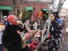 "La Société de Saint Anne" is a New Orleans Mardi Gras marching krewe that parades each Mardi Gras Day. La Société de Saint Anne was founded in 1969 by residents of the French Quarter and nearby Faubourgs who recognized the need for a return to earlier traditions of "walking krewes" which at one time were more prevalent but which had been overshadowed by the development of larger float parades in the early 20th Century. As the float parades grew in scale and number, they were forced to move out of the narrow streets of the French Quarter and onto broader venues uptown and in mid-City. The walking krewes were groups of neighbors from various wards of the city who took to the streets on foot, in celebration of their common love for the City of New Orleans and the food, music, drink, spirituality, and lifestyles that developed there during the 18th, 19th & 20th centuries. La Société de Saint Anne was formed to bring the celebration back down to street level and to revive this old tradition of celebration in the residents' own area. In the ensuing years, as the more bohemian elements of the French Quarter were forced to move further downriver to the Marigny and Bywater neighborhoods by rising property values and rents in the French Quarter, the krewe grew in size and inspired many other such walking krewes to form as subkrewes or as separate krewes altogether. The original krewe now can be identified by the cluster of crabnets (beribboned hoops carried aloft on long poles) and the presence of the Storyville Stompers.