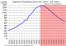 The population of Japan is expected to decrease by one-third during the next fifty years with about 40% of the remaining population being over 64 years old, a trend of the aging of Japan.[11] Financial burden and caring responsibilities are increasing for the future working generations. At the same time, a crisis is faced by Japanese universities as the young population shrinks. The number of 18-year-old people was expected to decrease from 2,050,000 in 1992 to 1,200,000 in 2007 and continue downwards. In 2000, sixty percent of the colleges were already unable to recruit enough students. The ageing population situation has created various social problems.[10]