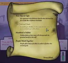 The designers noted during playtesting that there were alternative solutions to some of their puzzles. For instance, in the first round, the salesman comically argues that "deer steal our jobs", which the player is meant to counteract by asking for backing. Some players, however, presented the idea that "Deer live in the woods", arguing that they could not steal human jobs due to their location. The designers said this was a valid move and wrote into the game a customized response to it.[2][3] One important game mechanic is the ad hominem attack "Your face is ugly", which always fails in-game and was designed to teach players that this type of argument is unhelpful and flawed.[4] The game was designed to be more flexible and interactive than a book or film presentation of such philosophical debates.[4]