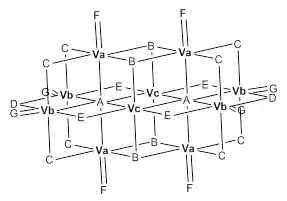 The decavanadate anions contains three sets of equivalent V atoms (see fig. 1).[3] These include two central VO6 octahedra (Vc) and four each peripheral tetragonal-pyramidal VO5 groups (Va and Vb). There are seven unique groups of oxygen atoms (labeled A through G). Two of these (A) bridge to six V centers, four (B) bridge three V centers, fourteen of these (C, D and E) span edges between pairs of V centers, and eight (F and G) are peripheral.