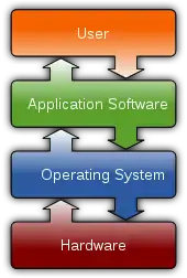 A diagram showing how the user interacts with application software on a typical desktop computer. The application software layer interfaces with the operating system, which in turn communicates with the hardware. The arrows indicate information flow.