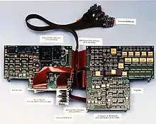 Sojourner's central processing unit (CPU) was an Intel 80C85 with a 2 MHz clock, addressing 64 kilobytes (Kb) of memory, and running a cyclic executive.[31] It had four memory stores; 64 Kb of RAM made by IBM for the main processor, 16 Kb of radiation-hardened PROM made by Harris, 176 Kb of non-volatile storage made by Seeq Technology, and 512 Kb of temporary data storage made by Micron. The electronics were housed inside the rover's warm electronics box (WEB).[2] The WEB is a box-like structure formed from fiberglass facesheets bonded to aluminum spars. The gaps between facesheets were filled with blocks of aerogel that worked as thermal insulation.[32] The aerogel used on the Sojourner had a density of approximately 20 mg/cc.[33] This insulator was designed to trap heat generated by rover's electronics; this trapped heat soaked at night through the passive insulation maintaining the electronics in the WEB at between −40 and 40 °C (−40 and 104 °F), while externally the rover experienced a temperature range between 0 and −110 °C (32 and −166 °F).[2]