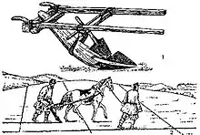 In Russia, Finland, and a few nearby countries, a sokha (Russian: соха, Lithuanian: žagrė) is a light wooden ard, consisting of two body ards, with their parallel beams forming the two shafts for a single horse-drawn tillage implement with two socket shares (рассоха).[1] In later types the double body is combined into one wooden board. Chronicles and other literary sources show that the sokha was in use in Russia at least since the 13th century. It originated from northern Russia, e.g., around Novgorod.[2][3]