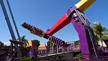 Sol Spin is a swinging Top Scan ride at Knott's Berry Farm built by Mondial Rides. Riders spins in a circular rotation while swinging in an angle. The ride opened to the general public on April 21, 2017 in the Fiesta Village section of the park.[1] Designed by Mondial, Sol Spin is a tipsy top turvy adventure taking places 6 stories high over Fiesta Village. As the ride lifts off the ground, riders begin spinning in a circular motion while guests are spun around. At its peak, Sol Spin rotates guests in circular motion at 60 feet in the air. Riders can experience up to 4gs at the peak of the ride. In addition, the ride is located on the former spot of Windseeker which was also built by Mondial. Sol Spin is unique as it is the largest Mondial Top Scan to this day. Knott's Sol Spin was customized to fit in the former location of Windseeker.[2]