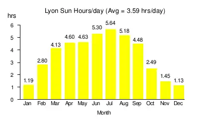 The insolation in France ranges from 3 sun hours/day in the north to 5 sun hours/day in the south. The output of a solar array is a function of age, temperature, tilt, shading, tracking, and insolation.