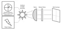 A solar simulator (also artificial sun or sunlight simulator) is a device that provides illumination approximating natural sunlight. The purpose of the solar simulator is to provide a controllable indoor test facility under laboratory conditions. It can be used for the testing of any processes or materials that are photosensitive, including solar cells,[1] sun screen,[2] cosmetics,[3] plastics, aerospace materials,[4] skin cancer,[5] bioluminescence,[6] photosynthesis,[7] water treatment,[8] crude-oil degradation,[9] and free radical formation.[10] Solar simulators are used in a wide range of research areas including photobiology,[11] photo-oxidation,[12] photodegradation,[13] photovoltaics,[14] and photocatalysis.[15]