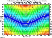 And at any given location on any given day, the solar zenith angle, , reaches its maximum, , at local midnight when the hour angle , or , namely, , or . If , it is polar day.