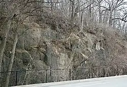 The formation is located northeast of the junction of Wood Avenue and General Mitchell Boulevard, on the Clement J. Zablocki Veterans Affairs Medical Center grounds.[1][3] It consists of the lower 35 feet (11 m) of a 70-foot (21 m) high bluff extending east–west for a distance of about 450 feet (140 m). The bluff is the only fully natural formation of its type remaining in Milwaukee County. It is located on the northern border of the VA grounds.[4]