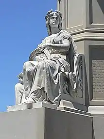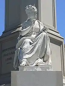 The Soldiers' National Monument is a Gettysburg Battlefield memorial which is located at the central point of Gettysburg National Cemetery.[4] It honors the battle's soldiers and tells an allegory of "peace and plenty under freedom … following a heroic struggle."[2] In addition to an inscription with the last 4 lines of the Gettysburg Address, the shaft with 4 buttresses has 5 statues:[5]: 166