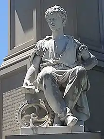 Massachusetts approved appropriations to the Gettysburg Soldiers' National Monument Association on March 14, 1865;[6] and in May, David Wills invited veterans organizations for the extensive July 4 cornerstone ceremony[7] (lithographs of the "design proposed by J. G. Batterson"[5]: 10 were available by July 19, 1865.)[8] The monument structure was built at Batterson's works at Westerly, Rhode Island,[8] and the Genius of Liberty[3] grasping sword and laurel wreath[9] was sculpted in Rome[3] (arrived October 1868).[10] The monument without the "Plenty" or "Peace" statues[3] was dedicated in 1869 with the prayer by Rev. Henry Ward Beecher, followed by an address by Gen. George G. Meade, oration by Senator Oliver P. Morton, and poem by Bayard Taylor.[11] The monument's "Plenty" statue was placed on August 26, 1869;[12] and a record of the cornerstone and dedication ceremonies was published in 1874.[13] Contrary to popular belief, the monument does not rest on the site of the oration of the Gettysburg Address (nor does the Gettysburg address monument, 300 yards to the south).[14] Modern scholarship places the site of the speech about 40 yards east of the soldier's monument. When he gave the speech, at a spot that is now within the civilian cemetery, he was facing west, toward a flagpole that stood where the soldier's monument was later erected.