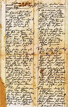 Jean Fredman (1712 or 1713–1767) was a real watchmaker of Bellman's Stockholm. The fictional Fredman, alive after 1767, but without employment, is the supposed narrator in Bellman's epistles and songs.[4] The epistles, written and performed in different styles, from drinking songs and laments to pastorales, paint a complex picture of the life of the city during the 18th century. A frequent theme is the demimonde, with Fredman's cheerfully drunk Order of Bacchus,[5] a loose company of ragged men who favour strong drink and prostitutes. At the same time as depicting this reality, Bellman creates a Rococo picture of life, full of classical allusion, following the French post-Baroque poets; the women, including the beautiful Ulla Winblad, are "nymphs", and Neptune's festive troop of followers and sea-creatures sport in Stockholm's waters.[6] The juxtaposition of elegant and low life is humorous, sometimes burlesque, but always graceful and sympathetic.[3] The songs are "most ingeniously" set to their music, which is nearly always borrowed and skilfully adapted.[7] Bellman wrote the first draft of Epistle 48 early in 1772, apparently while at work, as it is penned on a sheet of ready-lined record paper of his employer the General Directorate of Customs.[8]