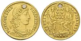The solidus was introduced by Constantine the Great in c. AD 312 and was composed of relatively solid gold.[1][2][3] Constantine's solidus was struck at a rate of 72 to a Roman pound (of about 326.6 g) of gold; each coin weighed 24 Greco-Roman carats (189 mg each),[4] or about 4.5 grams of gold per coin. By this time, the solidus was worth 275,000 increasingly debased denarii, each denarius containing just 5% silver (or one twentieth) of the amount it had three and a half centuries beforehand.[5] With the exception of the early issues of Constantine the Great and the odd usurpers, the solidus today is a much more affordable gold Roman coin to collect, compared to the older aureus, especially those of Valens, Honorius and later Byzantine issues.