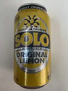 Solo is an Australian, lemon-flavoured, carbonated soft drink currently manufactured under license by Asahi Breweries. First launched by Cadbury-Schweppes Pty Ltd in 1973, its lemon flavour is inspired by Australian pubs' traditional and popular non alcoholic 'pub squash' beverage.[1][2] The drink's recognition amongst the Australian population has been attributed to the brand's long lasting "Solo Man" marketing campaign, featuring numerous Australian actors.[3] Solo and Asahi Holdings operates in the soft drink manufacturing industry along with various other brands such as Coca-Cola. The usual 375mL can of Solo contains 43.1 grams of sugar. There are and have been in the past, various versions of Solo available. These include Solo Zero, which uses artificial sweetener instead of sugar and there has also been a lemon and lime flavoured variant of the original recipe.