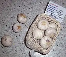 Solo garlic, also known as single clove garlic, monobulb garlic, single bulb garlic, or pearl garlic,[1] is a type of Allium sativum (garlic).[2] The size of the single clove differs from approximately 25 to 50 mm in diameter. It has the flavour of the garlic clove but is somewhat milder and slightly perfumed. The appearance is somewhat akin to that of a pickling onion, with white skin and often purple stripes. Solo garlic offers the advantage, compared to traditional garlic, of being very quick and easy to peel.