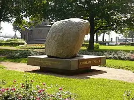 The unhewn stone was successfully transported to St. Petersburg where on 4 September 2002 it was installed on the pedestal. Three more inscriptions were added around the four edges of the base.[21] It was 12 years to the day since the base was put in position.[20] The official inauguration took place on 30 October on the Day in Remembrance of the Victims of Political Repression, which coincided with the 300th Anniversary of St. Petersburg. City Governor Vladimir Yakovlev issued Decree No. 2572-pa, making the Solovki Stone city property[21][22] as of 15 October 2002.