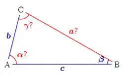 Some sources recommend to find angle β from the law of sines but (as Note 1 above states) there is a risk of confusing an acute angle value with an obtuse one.