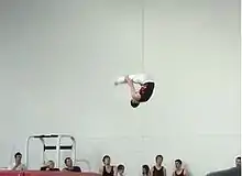 A somersault (also flip, heli, and in gymnastics salto) is an acrobatic exercise in which a person's body rotates 360° around a horizontal axis with the feet passing over the head.[1] A somersault can be performed forwards, backwards or sideways and can be executed in the air or on the ground. When performed on the ground, it is typically called a roll.