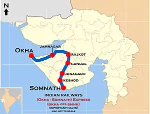 The 19251/19252 Somnath–Okha Express is an Express train belonging to Western Railway zone that runs between Somnath and Okha in India. It is currently being operated with 19251/19252 train numbers on a daily basis.[1]