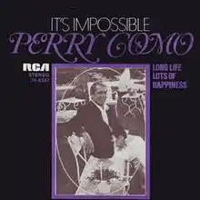 "Somos Novios" (Spanish for "We Are Lovers") is a song first recorded by Mexican songwriter Armando Manzanero in 1968.[1] Originally a French song "J'ai le mal de toi", different versions with unrelated lyrics in different languages have been written and recorded.[2] Perry Como recorded an English version of "Somos Novios" with original English lyrics titled "It's Impossible", which was a top 10 hit in the US and the UK.