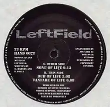 "Song of Life" is the fourth single released by English electronic group Leftfield and the first on a CD single release. The song was released on 12" and CD on 30 November 1992. The sleeve of the single had the footnote "dedicated to the memory of Steve Walters whose support, friendship and encouragement will never be forgotten".[1] It reached #59 in the UK charts. The song was also used as the backing track for Channel 4's Dispatches programme. The Remix 12" featured two remixes by British electronic music then-trio Underworld: "The Lemon Interrupt Mix", as well as the "Steppin' Razor Mix", which both feature on Sasha & John Digweed's mix album Renaissance: The Mix Collection. The track appears in the movie Lara Croft: Tomb Raider and its soundtrack.[2]