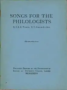 Songs for the Philologists is a collection of poems by E. V. Gordon and J. R. R. Tolkien as well as traditional songs.[1] It is the rarest and most difficult to find Tolkien-related book. Originally a collection of typescripts compiled by Gordon in 1921–1926 for the students of the University of Leeds, it was given by A. H. Smith of University College London, a former student at Leeds, to a group of students to be printed privately in 1935 or 1936, and printed in 1936 with the impressum "Printed by G. Tillotson, A. H. Smith, B. Pattison and other members of the English Department, University College, London."