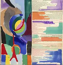 The Delaunays' friend, the poet and art critic Guillaume Apollinaire, coined the term Orphism to describe the Delaunays' version of Cubism in 1913. It was through Apollinaire that in 1912 Sonia met the poet Blaise Cendrars who was to become her friend and collaborator. Sonia Delaunay described in an interview that the discovery of Cendrars' work “gave me [her] a push, a shock.”[4] She illustrated Cendrars' poem La prose du Transsibérien et de la Petite Jehanne de France (Prose of the Trans-Siberian and of Little Jehanne of France) about a journey on the Trans-Siberian Railway, by creating a 2m-long accordion-pleated book. Using simultaneous design principles the book merged text and design. The book, which was sold almost entirely by subscription, created a stir amongst Paris critics. The simultaneous book was later shown at the Autumn Salon in Berlin in 1913, along with paintings and other applied artworks such as dresses, and it is said that Paul Klee was so impressed with her use of squares in her binding of Cendrars' poem that they became an enduring feature in his own work.
