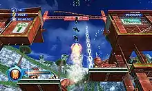 Each planet is split into seven parts: six main levels called acts and a boss level.[3] In each act, players must guide Sonic to the goal, whilst defeating enemies and dodging obstacles. In boss levels, players face one of Eggman's large robots, and must defeat it. Gameplay seamlessly shifts between side-scrolling and third-person perspectives.[3][5] Upon completion of a level, players are given a grade dependent on their performance, with an "S" being the best and a "D" being the worst.[6] As the player progresses through the game, more planets become available to select. Once each planet has been completed, a bonus seventh, which concludes the story, is unlocked.[7]