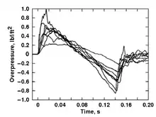 For today's supersonic aircraft in normal operating conditions, the peak overpressure varies from less than 50 to 500 Pa (1 to 10 psf (pound per square foot)) for an N-wave boom. Peak overpressures for U-waves are amplified two to five times the N-wave, but this amplified overpressure impacts only a very small area when compared to the area exposed to the rest of the sonic boom. The strongest sonic boom ever recorded was 7,000 Pa (144 psf) and it did not cause injury to the researchers who were exposed to it. The boom was produced by an F-4 flying just above the speed of sound at an altitude of 100 feet (30 m).[5] In recent tests, the maximum boom measured during more realistic flight conditions was 1,010 Pa (21 psf). There is a probability that some damage — shattered glass, for example — will result from a sonic boom. Buildings in good condition should suffer no damage by pressures of 530 Pa (11 psf) or less. And, typically, community exposure to sonic boom is below 100 Pa (2 psf). Ground motion resulting from sonic boom is rare and is well below structural damage thresholds accepted by the U.S. Bureau of Mines and other agencies.[6]