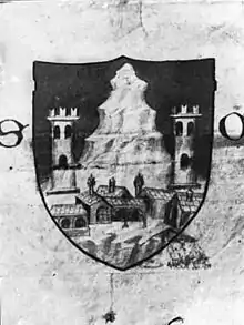 The blazon of the municipal coat of arms is Gules a saltire argent and in chief tower of the same. The St. Andrew cross refers to the patron saint of the church.[8]" The Castellanza's coat of arms was a white unicorn in a blue background. It is still visible in the "Casa della ragione" entrance fresco, in the main square "Piazza Grande". The current municipal blazon was donated by the milan Sforza's family in the 15th century.