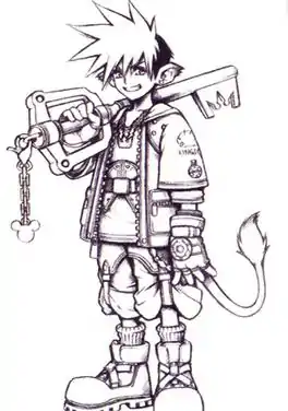 Sora was designed by Tetsuya Nomura as the protagonist of Kingdom Hearts. He was not originally slated to be the protagonist, as Disney wanted Donald Duck to fill the role, while Square wanted Mickey Mouse. Nomura designed Sora with the concepts of the Disney characters in mind, basing his outfit on Mickey Mouse's trademark white gloves, red shorts and giant yellow shoes.[1] Sora originally wielded a weapon resembling a chainsaw; however, the weapon was not well received by Disney, which led Nomura to redesign the weapon into a Keyblade. He was also designed with lion-like features, which were removed as the staff found them to be similar to those of Final Fantasy IX protagonist Zidane Tribal. The design was further reworked after a talk with the Disney staff, and Nomura finished it after a night's work.[2] Because Sora was a new character in the first Kingdom Hearts, Square added Final Fantasy characters who support the protagonist.[3]