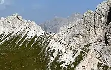 Sorapiss, with its huge perpendicular faces,[3] forms part of the mountainous backdrop to the resort town of Cortina, situated roughly 9 kilometres (5.6 mi) to the southeast of the town. The limestone dolomite formations, which are irregular, rugged and sharp-edged peaks, are part of the Eastern Alps.[4] The Cristallo group lies to the north past the Passo Tre Croci, and its southern neighbour is the Antelao. A path to Sorapiss starts at Passo Tre Croci and continues along an easy slope, reaching the refuge at the base of the Sorapiss range, close to Lago di Sorapiss, which is at an elevation of 1,923 metres (6,309 ft).[5]