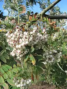 Sorbus forrestii, Forrest’s rowan, is a species of flowering plant in the family Rosaceae, native to Western China. Growing to 8 m (26 ft) tall and broad, it is a spreading deciduous tree with leaves up to 20 cm (7.9 in) long, each divided into up to 19 leaflets (pinnate). White flowers in spring are followed by masses of white berries with pink tips in autumn.[2]