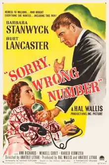 Sorry, Wrong Number is a 1948 American thriller film noir directed by Anatole Litvak,[2] from a screenplay by Lucille Fletcher, based on her 1943 radio play of the same name. The film stars Barbara Stanwyck and Burt Lancaster, with Ann Richards, Wendell Corey, and Harold Vermilyea. Stanwyck was nominated for the Academy Award for Best Actress. It is one of the few pre-1950 Paramount Pictures films, which remained in the studio's library (the rest are currently owned by NBCUniversal).