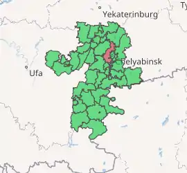 Sosnovsky District (Russian: Сосно́вский райо́н) is an administrative and municipal district (raion), one of the twenty-seven in Chelyabinsk Oblast, Russia.[1] It is located in the northern central part of the oblast. The area of the district is 2,112 square kilometers (815 sq mi).[2] Its administrative center is the rural locality (a selo) of Dolgoderevenskoye.[1] Population: 60,941 (2010 Census);[3] 58,570 (2002 Census);[6] 54,328 (1989 Census).[7] The population of Dolgoderevenskoye accounts for 12.6% of the district's total population.[3]