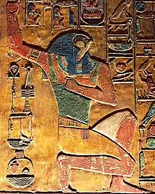The Souls of Pe and Nekhen, mentioned first in the Pyramid Texts,[1] refer to the ancestors of the ancient Egyptian kings. Nekhen (Greek Hierakonpolis) was the Upper Egyptian centre of the worship of the god Horus, whose successors the Egyptian pharaohs were thought to be. Pe (Greek Buto) was a Lower Egyptian town, not known for its Horus worship,[2] but Ra had awarded the town to Horus after his eye was injured in the struggle for the throne of Egypt.[3]