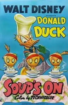 Soup's On is a 1948 Donald Duck animated short film directed by Jack Hannah, produced in Technicolor by Walt Disney Productions and released to theaters by RKO Radio Pictures.[1] In the short, Donald cooks a turkey dinner for his nephews Huey, Dewey and Louie, but when they come to the table with dirty hands, he punishes them by sending them to bed. The nephews escalate the battle, and when Donald is knocked unconscious, they trick him into thinking that he has died and become an angel.