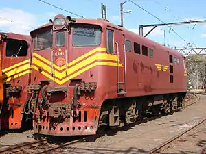 The whole series was delivered in the Gulf Red livery with signal red cowcatchers, yellow whiskers, full body-length side-stripes and with the number plates on the sides enclosed in three-stripe wings. In the 1970s the side-stripes were curtailed to just beyond the cab-sides, but with the number plates on the sides still enclosed in three-stripe wings. In the 1990s many of the Series 5 units were repainted in the Spoornet orange livery.[12]