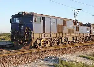 Since huge voltage drops are often encountered between electric sub-stations, the locomotive was designed to be able to operate on a supply varying between 55 and 25 kV AC. The battery boxes and the main air reservoirs are mounted between the bogies underneath the frame, where a compartment also houses a small motor scooter for use by the crew for lineside inspections of the train, which can be up to nearly 4 kilometres (2.5 miles) long.[3]