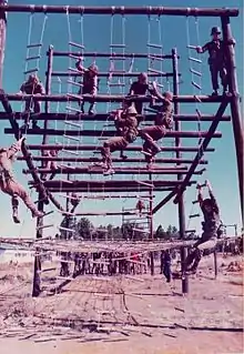 The military was mostly composed of white South Africans, who alone were subject to conscription.[17][18][19] However, black South Africans were the second largest group, and Asians and Coloured citizens with mixed ancestry were eligible to serve as volunteers, several attaining commissioned rank. From 1971 onwards, several black battalions were raised in the Infantry and Service Corps on a tribal basis, most Black soldiers serving in these exclusive tribal Battalions, which had black NCOs but white commissioned officers. The first black personnel were accepted into commissioned ranks only from 1986, and then only for serving black soldiers and NCOs. The regular Commission would not be open for Bantus until 1991, and then again they would serve only in black units or Support/Service Support units, to avoid having position of authority over white combat arms personnel. The first black officer to be promoted to Lieutenant Colonel rank and have command over a Battalion sized unit was only appointed in February 1994, by which time the old SADF was already on its deathbed. However, black officer candidates from the various Homeland Forces and from South West Africa/SWATF had been accepted since 1981[20] Units such as the 32 Battalion incorporated many black volunteers, as did the 101 Battalion.[21] Conscription was opposed by organisations such as the End Conscription Campaign, but overall, white morale remained high—as indicated by the few recruits tried for serious disciplinary offences.[3]