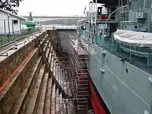 On 29 February 1980 HMAS Diamantina, the last World War II-era frigate to serve Australia, was decommissioned from the Royal Australian Navy. Diamantina was handed over to the Queensland Maritime Museum to be permanently berthed in the South Brisbane Dry Dock.[3] In March 2006, Diamantina left her berth for the first time in 25 years when she was towed out into the river to allow repairs to the dock,[4] which had been flooded since the seals failed in 1998.[5] On 10 May 2006, she returned to the South Brisbane Dry Dock adjacent to the Queensland Maritime Museum,[6] where she was used as a self-touring museum ship. During the 2010–2011 Queensland floods, the dry dock flooded but the ship had been maintained in good repair and floated up from the dry dock with the flood, while volunteers adjusted the ropes to prevent the ship bashing against the dry dock. The ship was undamaged.[7][8]