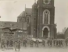 The 118th Infantry (formerly the 1st SC Infantry) formed one of the four infantry regiments that made up the 30th Division. The 30th trained at Camp Sevier outside Greenville, SC and was sent to France. The 118th, along with the rest of the division (minus the division's artillery regiment) fought under British Expeditionary Force command. The 30th alongside the 27th Division (the federalized NY National Guard) formed 2nd Corps. After further training with the British, the 30th Division was sent to Kemmel, Belgium (just south of Ypres), where the 118th got their first time in the trenches. Although relatively quiet, the 118th was able to learn a great deal from this experience. In preparation for the last great Allied Offensive, the division trained alongside tanks prior to being moved to the edge of the German Hindenburg Line. On 29 September, the 118th infantry in reserve supported the breaking of the Hindenburg Line by other units of the 30th Division near the French village of Bellicourt. Following this success, the division continued to fight a retreating, but not defeated German Army. They suffered heavy casualties to German artillery, gas, and machine gun fire. The 118th fought until 19 October, not seeing combat again prior to the Armistice. The 118th had six Medal of Honor recipients (two posthumous) in their ranks to include future SCNG Adjutant General James Dozier. Many more men of the regiment were awarded Distinguished Service Crosses and foreign awards for valor.[9]