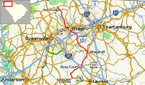 Northwest of Reidville, the highway interchanges with I-85 at exit 60, forming a parclo interchange. Continuing into Greer, the highway passes Greenville-Spartanburg International Airport before intersecting SC 80. In Greer, the highway intersects with SC 357's southern terminus and becomes concurrent with SC 290 heading west. It then runs concurrently with US 29 for about 0.3 miles (0.48 km) and then continues northwest. After about a tenth of a mile, SC 101 tracks north, crossing over the South Tyger River before making its way through Highland, and running concurrent with SC 414 for a tenth of a mile before continuing northwest. The route reaches its northern terminus at SC 11 in northern Greenville County.[5]