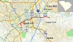 SC 122 starts at SC 72's eastern terminus on Johnston Street before exiting just north of the intersection onto Dave Lyle Boulevard. From there, it follows Dave Lyle Boulevard northeasterly, intersecting Main Street and further down a full interchange with U.S. Route 21 (US 21)/SC 121. The highway continues on a more easterly course to an interchange with Interstate 77 (I-77) before terminating at Waterford Park Drive.[2]