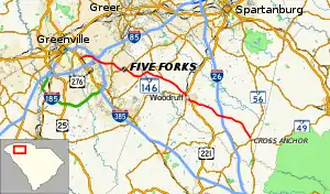 SC 146's western terminus is at Laurens Road (U.S. Route 276 or US 276), near the intersection of Interstates 85 (I-85) and 385.[3] Its course then goes in a southeasterly direction where its eastern terminus is at its intersection with SC 56 near Cross Anchor.[3]