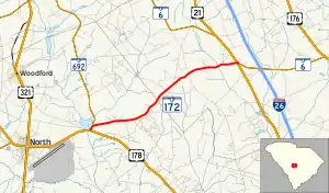SC 172 begins at an intersection with U.S. Route 178 (US 178; North Road) east-northeast of North, within Orangeburg County. It travels to the north-northeast. Approximately 1,000 feet (300 m) later, it meets the eastern terminus of SC 692, with SC 172 heading to the east-northeast before it enters Calhoun County. It passes by the Do-Little Field airport just before it meets US 21 (Columbia Road). SC 172 continues another 0.09 miles (0.14 km) to end at SC 6 (Caw Caw Road).[3]