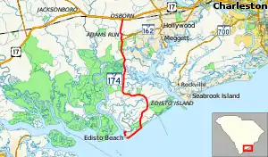 South Carolina Highway 174 (SC 174) is a 25.730-mile (41.408 km) state highway, connecting Edisto Beach with the western part of the Charleston area, in the southeastern part of the U.S. state of South Carolina. The highway was designated a South Carolina scenic byway in 1988. In 2009, the U.S. Department of Transportation declared that a 17-mile (27 km) stretch of SC 174 on Edisto Island would be designated as a National Scenic Byway.[3] According to the South Carolina Department of Transportation (SCDOT), the southern terminus is at the southern terminus of Yacht Club Road, where Palmetto Boulevard changes name to Dock Site Road. However, the signed southern terminus is at an intersection with Dock Site Road and the western terminus of Buoy Road, approximately 1,112 feet (339 m) to the northeast.
