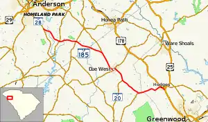 South Carolina Highway 185 (SC 185) is a 26.920-mile (43.324 km) state highway in the U.S. state of South Carolina. The highway connects Hodges and Due West with the Homeland Park area.