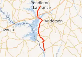 SC 187 begins at an intersection with SC 184 (Elberton Highway) southwest of Iva, within Anderson County. It travels in a fairly northerly direction. It passes Mountain View Cemetery and Poplar Spring Cemetery before intersecting SC 181 (Smith–McGee Road). They have a brief concurrency. SC 187 travels to the northwest and crosses over Weems Creek and then Buchanan Creek. It has an intersection with SC 412 (Rainey Road) and one with U.S. Route 29 (US 29). The highway begins curving to the northeast. In West Gate, it intersects SC 24. The two highways travel concurrently to the northwest and cross over part of Lake Hartwell on the Calvin Wesley Belcher Bridge. A short distance later, they split at the Portman Shoals Intersection, with SC 187 traveling to the north. It passes by a KOA Kampground just before an interchange with Interstate 85 (I-85). Just to the west of La France, the highway passes Pendleton High School. Farther to the northeast, it meets its northern terminus, an intersection with US 76/SC 28, just south of Pendleton.[2]
