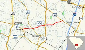 SC 217 begins at an intersection with SC 64 (Bells Highway) in Lodge, within Colleton County, where the roadway continues as a local road through town. It travels to the east and crosses over Horse Bay on an unnamed bridge. This bridge marks the Bamberg County line. Almost immediately is a crossing of the Little Salkehatchie River. It begins a concurrency with SC 362 (Hunters Chapel Road). Just before the concurrency ends, the two highways re-enter Colleton County. SC 217 splits off to the east-northeast and crosses Hog Branch. In Smoaks, it crosses over Buckhead Creek and has a one-block concurrency with U.S. Route 21 (US 21; Low Country Highway). It heads to the east and crosses over Bear Branch. The highway curves to the northeast before meeting its eastern terminus, an intersection with SC 61 (Augusta Highway), at a point northwest of Canadys. Here, the roadway continues as Salcro Lane.[3]